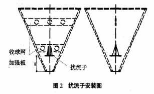 3)經(jīng)過與廠家協(xié)商,為克服循環(huán)水出口壓力偏高造成的膠球在收球網(wǎng)內(nèi)的強烈旋轉(zhuǎn),如圖2所示,在膠球清洗裝置內(nèi)部加裝擾流子,要求擾流子材質(zhì)為Q235,擾流子和收球網(wǎng)加強板要可靠地焊接。以降低凝汽器循環(huán)水出口的壓力及膠球在收球網(wǎng)內(nèi)部的旋轉(zhuǎn)強度,從而使膠球順利地落入收球網(wǎng)底部,及時送人收球泵人口管道。